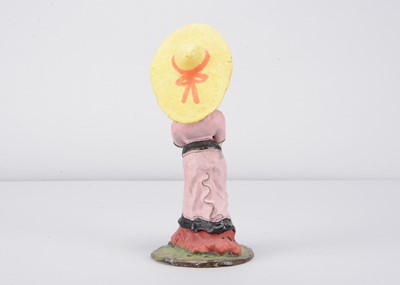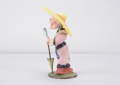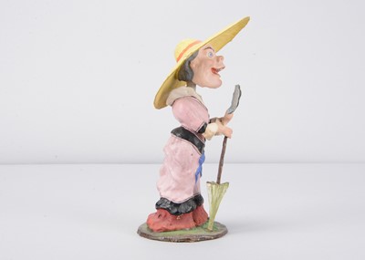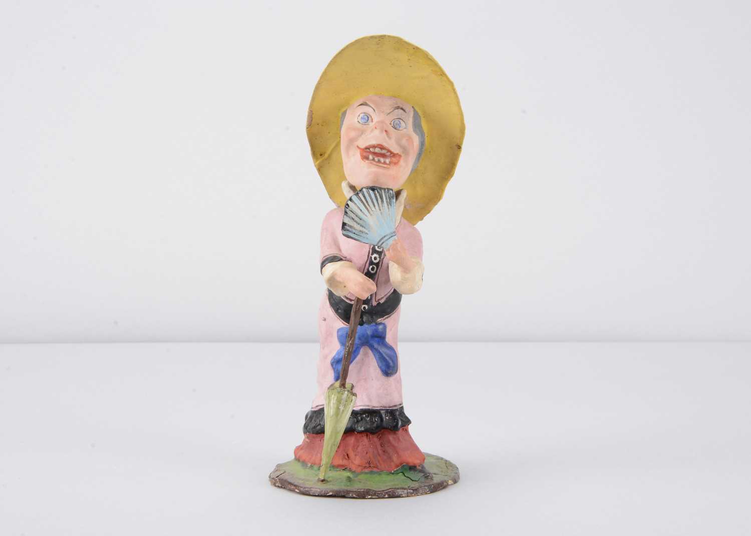A late 19th century Thüringen composition ugly woman nodder, with broad elongated yellow sunhat, very large toothy grin, pink bustle dress, holding fan and parasol —7 ¼in. (18.5cm.) high (slight restoration)
