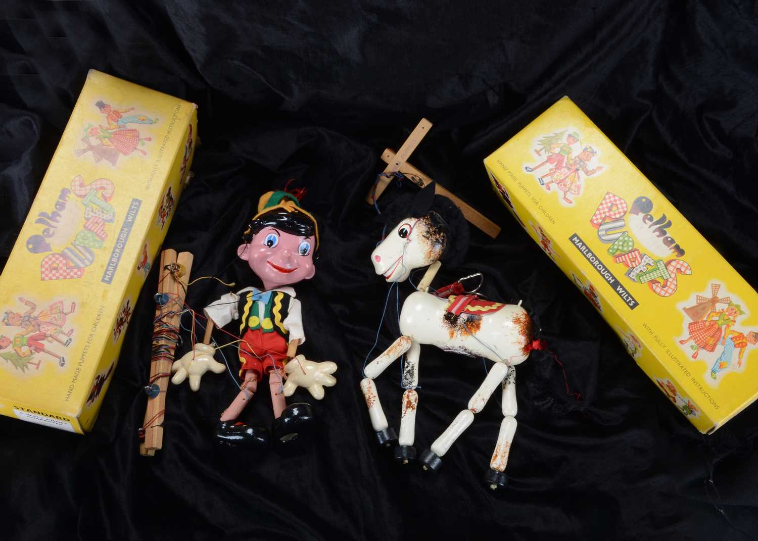 Pelham Puppet Walt Disney Pinocchio and Horse, in original yellow illustrated boxes with correct end labels