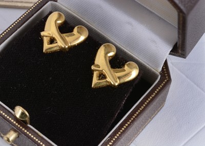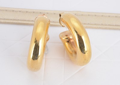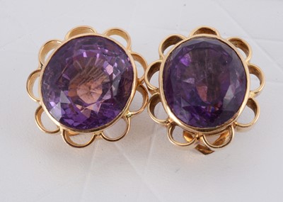 Lot 148 - A pair of yellow metal 750 marked amethyst clip earrings