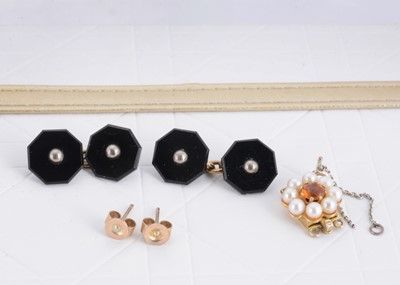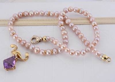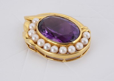 Lot 145 - A continental yellow metal 18k marked amethyst and pearl pendant