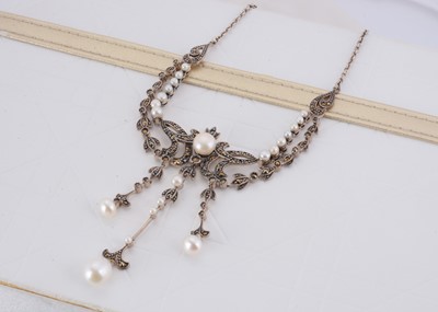 Lot 135 - An Edwardian style silver, marcasite and pearl fringe necklace