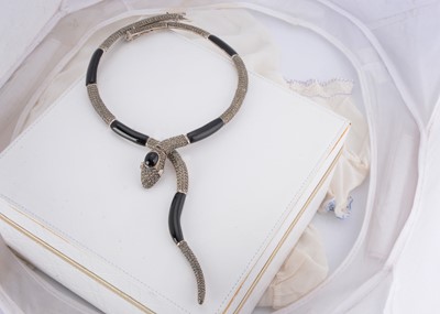 Lot 136 - A contemporary silver, marcasite and onyx serpent necklace