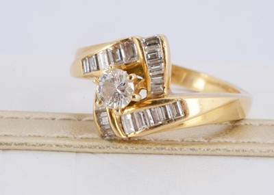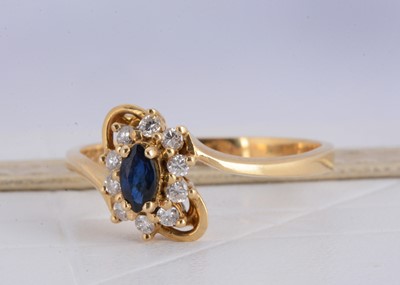 Lot 155 - A 750 marked yellow metal sapphire and diamond cluster crossover ring