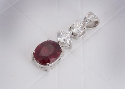 Lot 153 - A 750 marked white metal ruby and diamond drop pendant