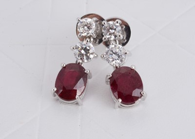Lot 154 - A pair of 750 marked ruby and diamond drop earrings