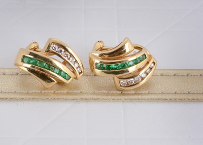 Lot 158 - A pair of continental 18k marked yellow metal emerald and diamond clips