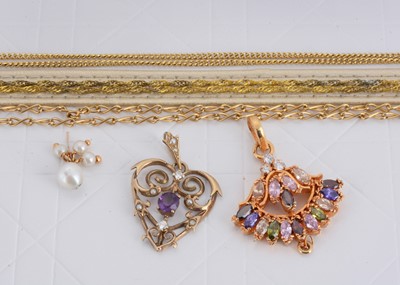 Lot 164 - A 9ct gold amethyst diamond and seed pearl heart shaped pendant